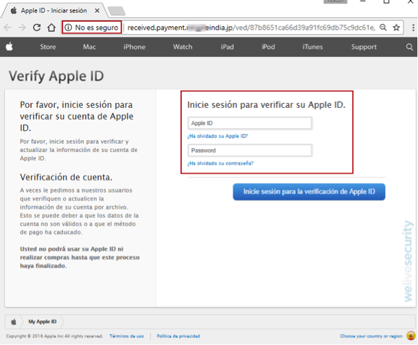 En caso de no advertir las señales del engaño y se haga clic en el enlace incluido en el correo se es redirigido a un sitio web que simula ser oficial, para verificar el AppleID del usuario. En la misma, se puede notar que no se trata de un sitio seguro, ya que no utiliza el dominio de Apple y que por lo tanto intentará robar el Apple ID y la contraseña que se ingresen.