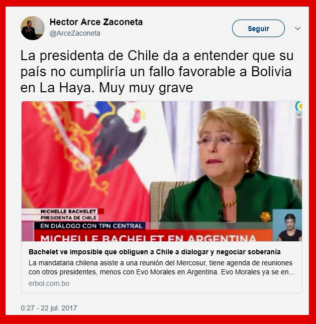 «La Presidenta de Chile da a entender que su país no cumplirá un fallo favorable a Bolivia en La Haya. Muy muy grave», remarcó en su cuenta oficial de Twitter, abriendo así un nuevo impasse en las ya deterioradas relaciones entre ambos países, relaciones que ha ido debilitando y deteriorando de manera constante el Gobierno de Evo Morales.