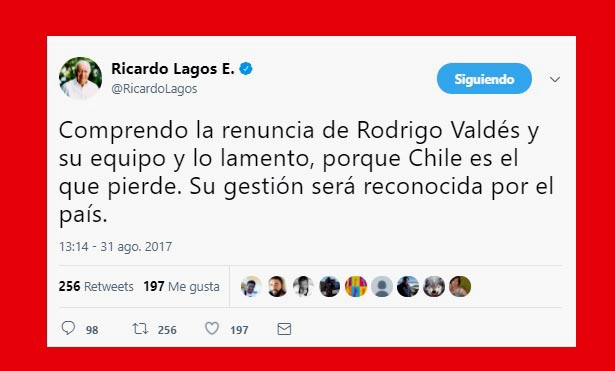 Una de las primera reacciones y en apoyo al cuestionado ahora ex ministro Rodrigo Valdés vino nada más y nada menos que del ex Presidente Lagos que en su cuenta de twitter escribió: «Comprendo la renuncia de Rodrigo Valdés y su equipo y lo lamento, porque Chile es el que pierde. Su gestión será reconocida por el país».