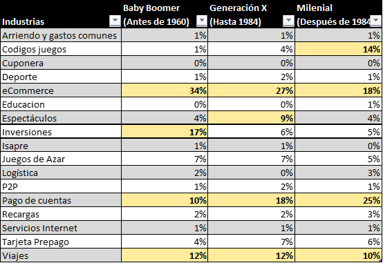 Roberto agrega que, sobre los hábitos de compra, es posible establecer que las personas de mayor edad realizan las transacciones electrónicas para compras del tipo eCommerce (flores, comida para mascotas y otros), inversiones y pago de cuentas. Lo usan mucho menos para el pago de arriendos, compra de códigos de juego, cupones de descuento y otras industrias.