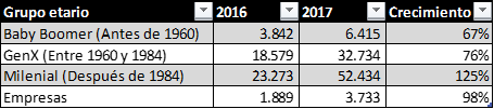 La tabla siguiente muestra velocidades de adopción muy distintas según el grupo etario: