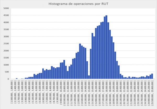 “Cuando un usuario paga con khipu, no sabemos su sexo, dirección, ni su nivel socio económico, pero conocemos su RUT, lo que es un indicador que permite estimar la edad. El gráfico muestra un histograma según número de RUT, usado en julio del 2017 para pagar con khipu. Sabemos que la asignación de RUT’s del Registro Civil no ha sido perfectamente continua y que entre los RUT más altos, hay algunos ciudadanos extranjeros, pero, aun así, la estimación es interesante”, señala Roberto.