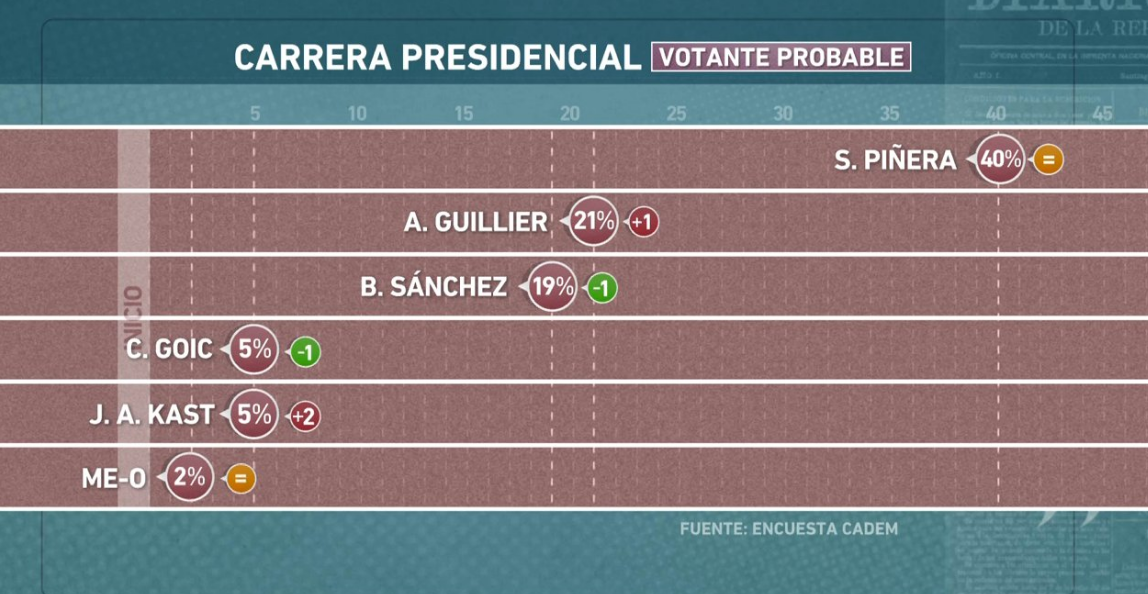Es en este punto, donde la periodista se ubica en el tercer lugar del estudio con 19 puntos y es seguida por Alejandro Guillier con 21 puntos, ambos lejos de la posición del abanderado de la derecha, Sebastián Piñera, quien marca 40% de las preferencias.