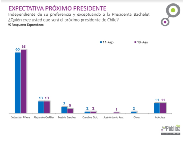 En cuanto a las expectativas presidenciales, Sebastián Piñera, sigue encabezando las preferencias, teniendo un incremento de tres puntos y quedando en el 68% de las menciones, seguido por Guillier con 13% y Sánchez con 5%.