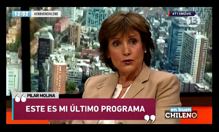 La periodista Pilar Molina Armas, prima de la esposa de Sebastián Piñera, estuvo en el cuerpo de Reportajes de El Mercurio hasta 2010, año en que lo deja el diario y se va de asesora del ministro de Salud de Piñera, estuvo en el dirctorio de TVN (2014 a 2016), nombrada por Piñera y dejó el cargo para conducir un programa en Radio Agricultura e integrarse como panelista de «En buen chileno» de TV13, programa en el que protagonizó varias polémicas. Este domingo en pleno programa la periodista renunció al programa: «Me voy a lo que más me gusta hacer, que es el periodismo». Deja el programa del canal de Luksic ahora.
