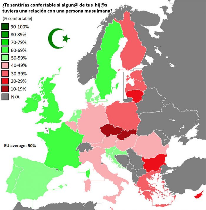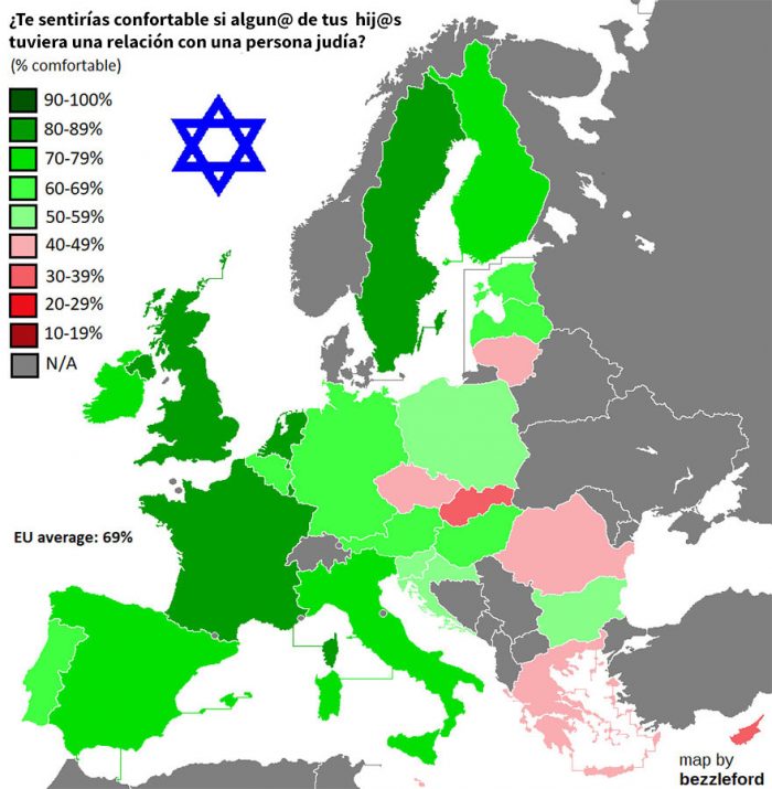 Aunque estos tonos de verde y rojo puedan impresionar a algunos, es más increíble aún que solo representen 4 de las preguntas que se hicieron. Según el estudio original, menos de la mitad de todos los que respondieron afirmaron aprobar que sus hijos salieran con una persona de etnia gitana o incluso una persona transexual.