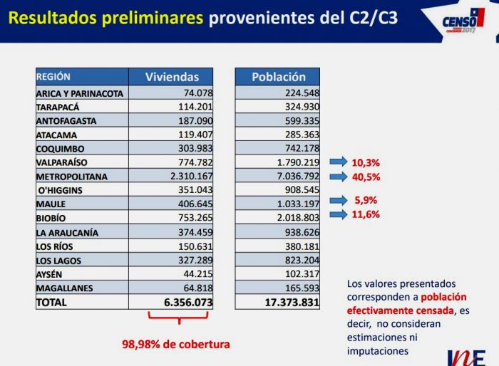 De acuerdo con los resultados preliminares del Censo 2017 que entregó esta mañana el Instituto Nacional de Estadísticas (INE), la población efectivamente censada en el proceso ascendió a 17.373.831 personas, mientras que el número de viviendas alcanzó las 6.356.073 unidades, lo que equivalió a una cobertura del 98,98% del total de viviendas.