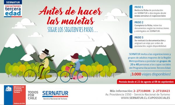Con el fin de hacer accesible el turismo a todos los segmentos de la población, el Servicio Nacional de Turismo —mediante uno de sus programas sociales más emblemáticos— ha permitido que a contar de esta nueva temporada puedan acceder a los beneficios de esta actividad los adultos mayores que pertenezcan a alguna agrupación o que simplemente reúnan grupos de 20 o 40 personas para ser parte de esta iniciativa.