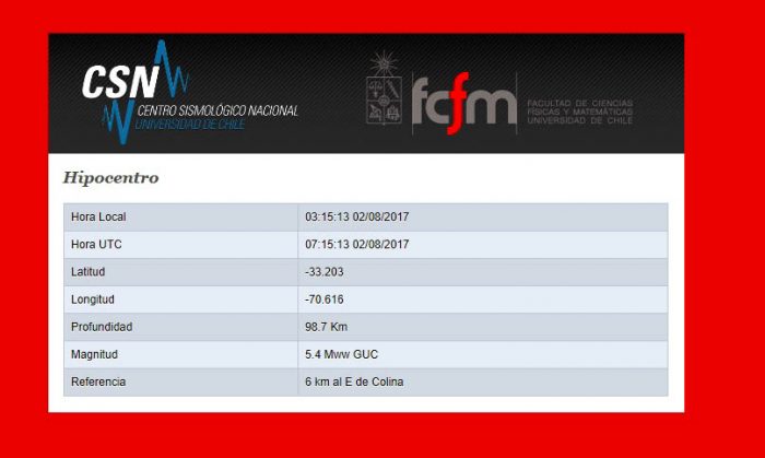 La primero información que emitió Onemi fue «Según el Centro Sismológico Nacional la magnitud del sismo fue de 5.6 Richter, a 25 Kms al Este de Farellones».