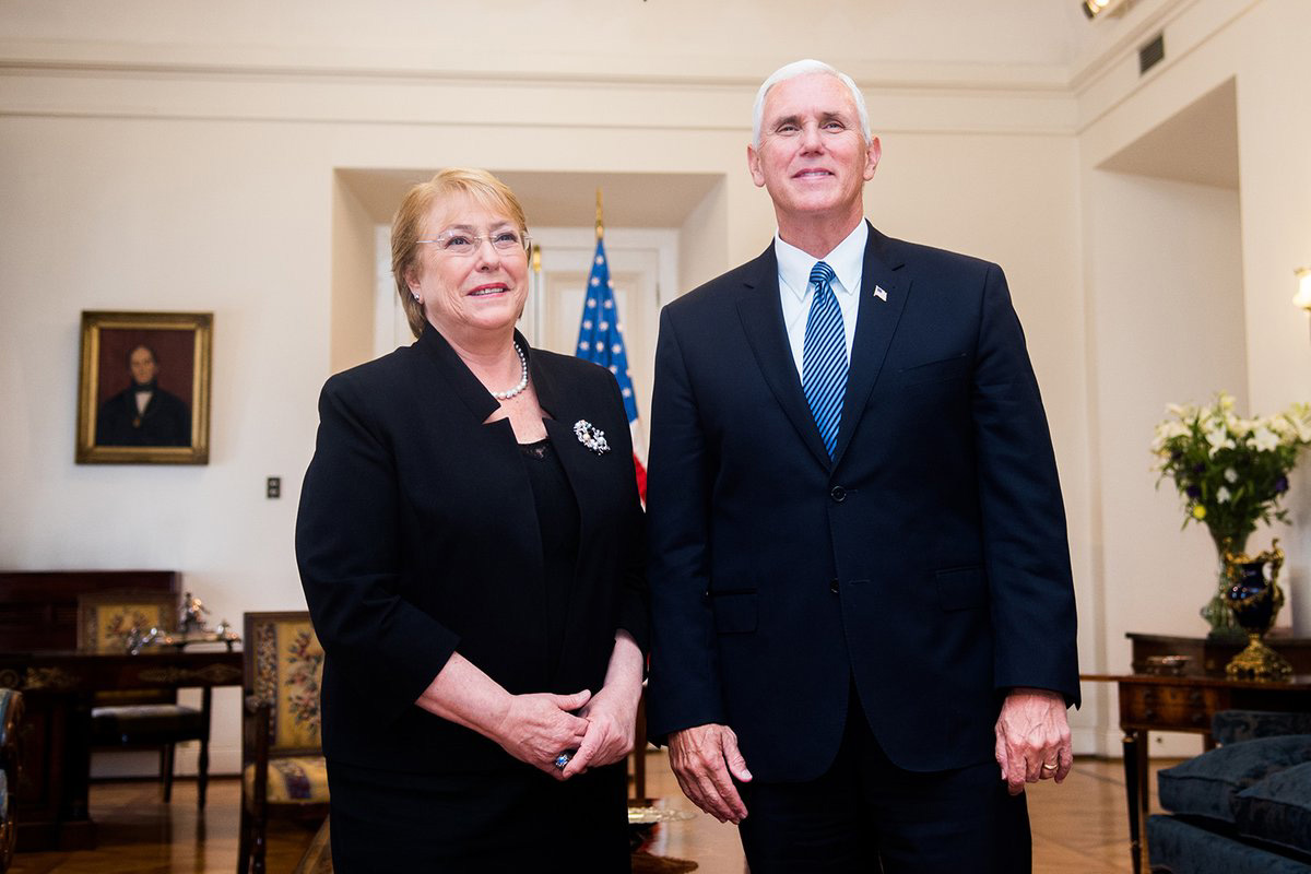 El vicepresidente de Estados Unidos, Mike Pence, le pidió formalmente a la presidenta Michelle Bachelet en el Palacio de La Moneda que Chile «rompa todos los lazos diplomáticos y comerciales» con Corea del Norte, país con el que el gobierno de Donald Trump mantiene un tenso conflicto a causas de las pruebas nucleares que viene realizando, señala un cable de Télam de Argentina.