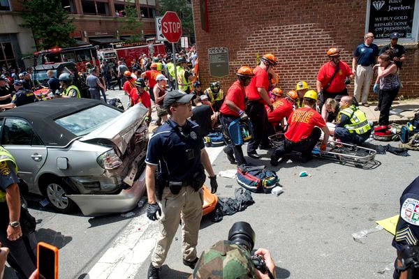 En medio de los enfrentamientos entre los miembros de ambos bandos, un vehículo ha embestido a la multitud. Un testigo ha comentado a la Unión Estadounidense por las Libertades Civiles de Virginia (ACLU of Virginia) que el auto dio marcha atrás y atropelló a los manifestantes después de que uno de los activistas de la contraprotesta lanzara una piedra al vehículo.