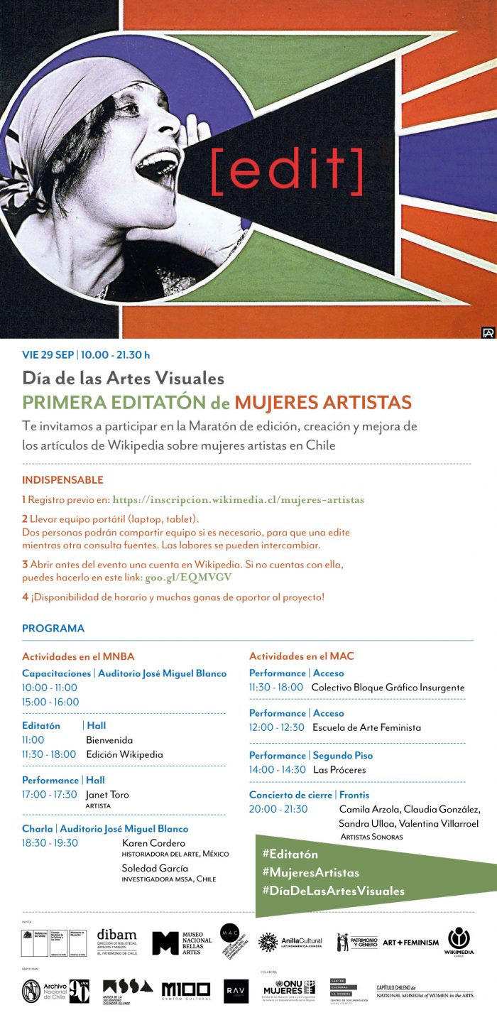 Con el fin de reflexionar e incorporar una mirada crítica sobre la participación de mujeres en las prácticas artísticas, programación de exposiciones y colecciones públicas, la actividad se realizará en el marco del Día de las Artes Visuales en el MNBA y en el MAC, entre las 10:00 y 21:30 hrs. La invitación es abierta a toda la comunidad, para lo cual deben registrarse previamente en Wikipedia.