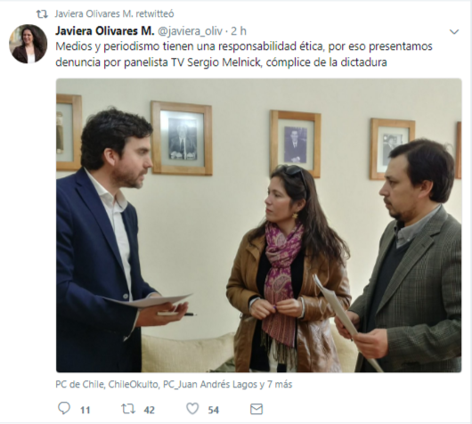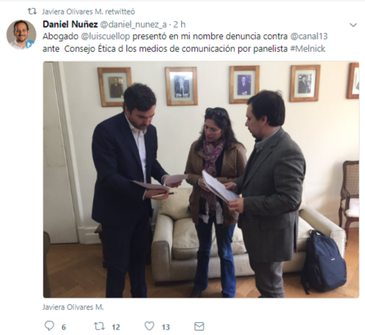 Luego del reclamo de la periodista, el diputado PC, Daniel Núñez, se hizo eco de la situación y a través de su cuenta en Twitter anunció que denunciaría a Canal 13 al Consejo de Ética de Medios de Comunicación “por tener como panelista a Melnick, cómplice de violaciones a DDHH”.