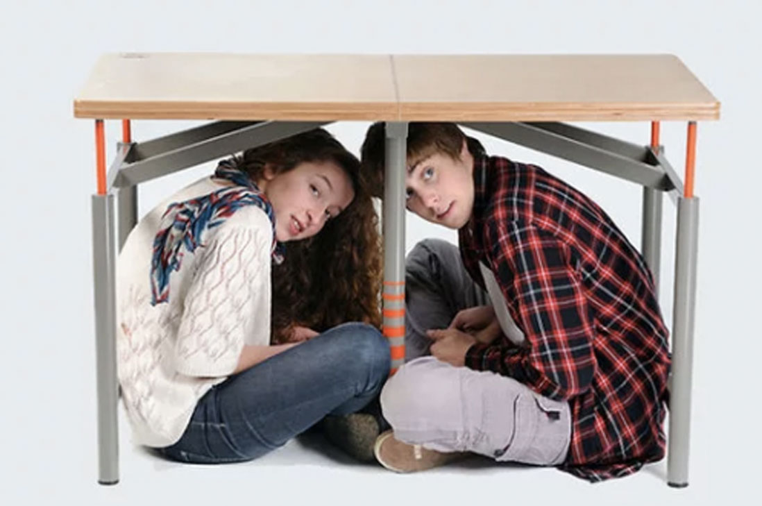 Y este súper mueble no ha dejado nada al azar, ya que junto con proteger a las personas que se refugien bajo ella, tiene un diseño que permite una fácil y rápida evacuación, haciendo expedito el pasar de bajo de una mesa a otra hasta salir de la sala de clases.
