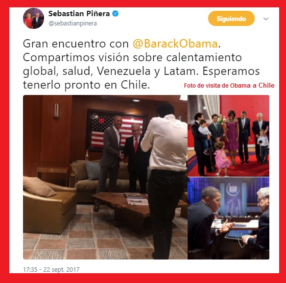«Cerrando una gran jornada desde Washington, EE.UU. Primero mantuvimos reunión con Luis Alberto Moreno, Presidente del Banco Interamericano de Desarrollo (BID) y tuvimos la oportunidad y el honor de dar una conferencia en el Wilson Center y el InterAmerican Dialogue. Mantuvimos también una interesante conversación con el Presidente Barack Obama, quien se mostró sumamente interesado e informado de lo que ocurre en Chile. Presidente Obama, en nuestro país lo esperamos con los brazos abiertos», escribió Piñera en su cuenta de Twitter y Facebook, aunque pareciera creer que aún Obama es el Presidente de Los Estados Unidos, al tratarlo de «Presidente» cuando es ex presidente.