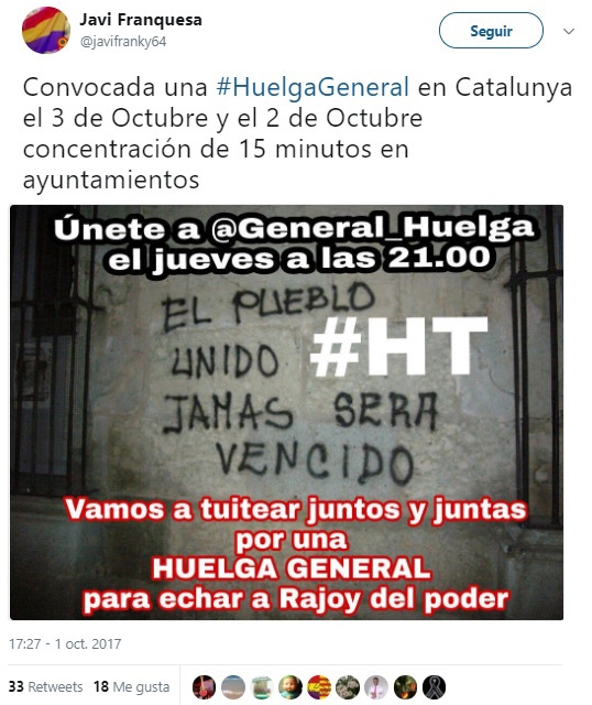 ¿Huelga general en Catalunya? ¿O “paro de país”? Ambas. Existe una huelga en ciernes, la que los sindicatos CGT, IAC, Intersindical CSC y COS convocaron la semana pasada para mañana y que se podría prolongar hasta el día 13, y que está secundada por la CUP. Incluso ya se han decretado y se están acordando servicios mínimos en los grandes sectores públicos y algunas empresas. Pero también fue el presidente de Òmnium, Jordi Cuixart, el que llamó a la huelga general, que bautizó como “huelga nacional”.