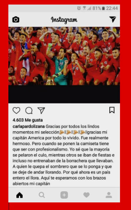 Pero sin duda una de las reacciones más controversiales, por el contenido de denuncia, es la de la esposa del capitán de La Roja, Carla Pardo Lizana que escribió en su cuenta de Instagram: “Gracias por todos los lindos momentos mi selección, gracias mi capitán América por todo lo vivido. Fue realmente hermoso. Pero cuando se ponen la camiseta tiene que ser con profesionalismo. Yo sé que la mayoría se pelaron el culo, mientras otros se iban de fiestas e incluso no entrenaban de la borrachera que llevaban. A quien le quepa el sombrero que se lo ponga y que se deje de andar llorando. Por qué ahora es un país entero el que llora. Aquí te esperamos con los brazos abiertos mi capitán”, posteó la esposa de Claudio Bravo a las 22:400 horas de este amargo 10 de octubre.