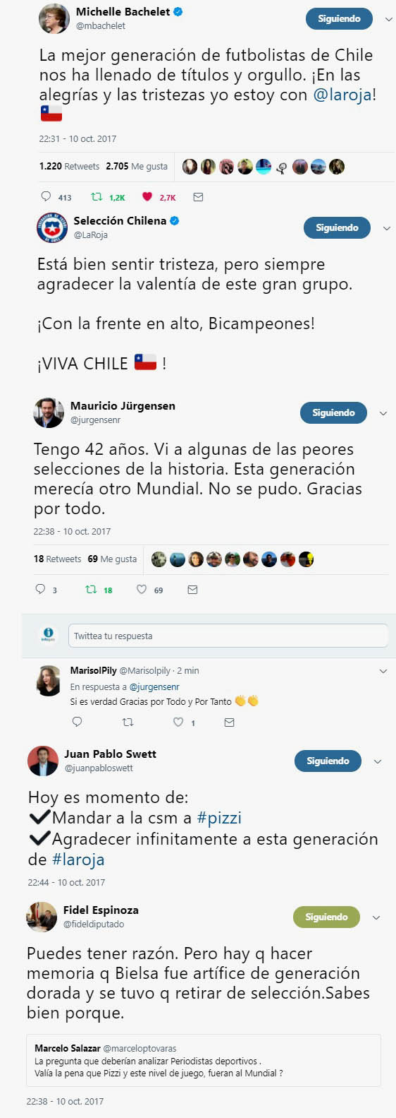 Una de las primeras reacciones la tuiteó la Presidenta Miachelle Bachelet que presenció en Brasil la estrepitosa derrota de la selección carioca por 3 goles a cero a la Selección Chilena y que sepultó la posibilidad de ir al Mundial Rusia 2018.