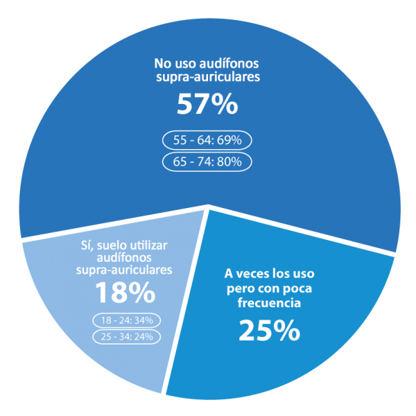 El estudio también arroja cómo es nuestro comportamiento al escuchar música en la radio o ver televisión. También es la gente más joven la que reconoce en mayor medida escuchar la radio a un volumen más alto que la media, un 44% de entre los 18 y 34 años. Con la televisión ocurre lo contrario, el 22% de los individuos entre 65 y 74 años reconoce que escucha la tele a un volumen más alto de lo normal.