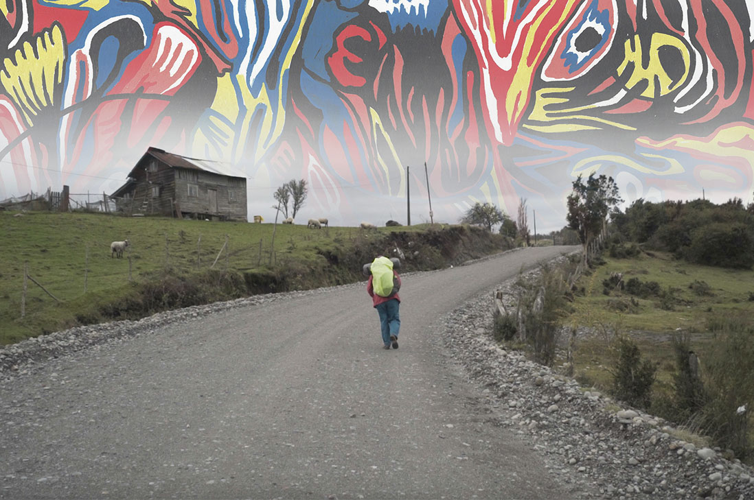 El video ubicado en la segunda sala es un registro del viaje que la artista hizo en junio de este año a la Región de Los Lagos en el que registra la caminata que realizó, mochila al hombro, desde Puerto Montt hasta Ensenada, motivada por textos escritos tanto por autores como Darwin y Humboldt como por colonos de la zona que describen el territorio como indómito y de difícil acceso. Para poder ingresar a la sala de proyección el espectador debe cruzar un mural de colores primarios, blanco y negro que ocupa parte importante de la sala.