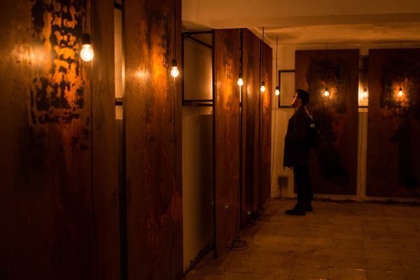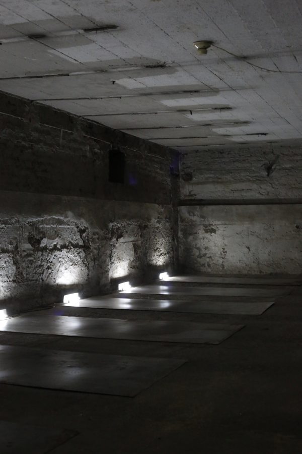Trenodia está compuesta por planchas grabadas en acero, luces fluorescentes y ampolletas, y cajas de audio dispuestas en series repetidas. El resultado es una instalación deliberadamente oscura, que materializa lo intangible de lo cotidiano que esconde una ciudad.