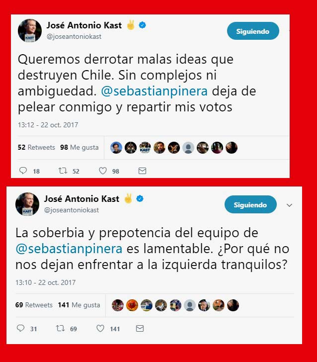 La respuesta de Kasta –vía Twitter- no se dejó esperar y disparó: “Queremos derrotar malas ideas que destruyen Chile. Sin complejos ni ambigüedad. @sebastianpinera deja de pelear conmigo y repartir mis votos”.