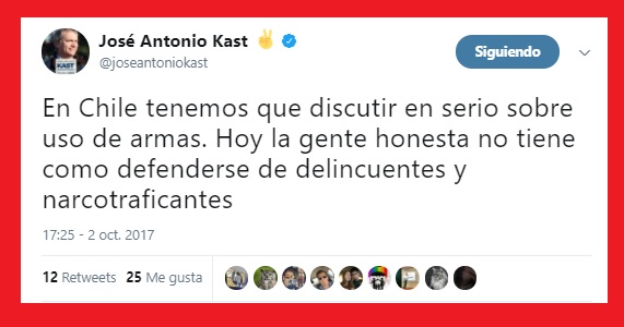 «Yo soy partidario de que uno pueda tener un arma legítimamente inscrita, a diferencia de lo que ha ocurrido en Brasil o Venezuela, donde ha aumentado la cantidad de asesinatos porque han restringido la posibilidad de que alguien tenga un arma inscrita», afirmó José Antonio Kast.