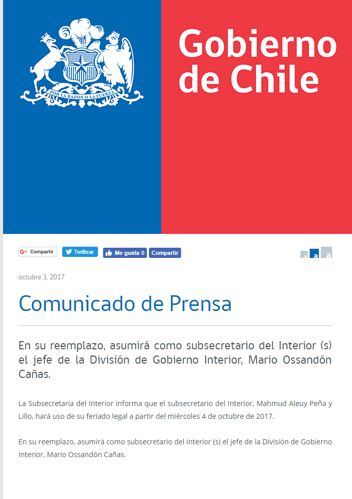 A través de un escueto comunicado, la subsecretaría del Interior dijo que “el subsecretario del Interior, Mahmud Aleuy Peña y Lillo, hará uso de su feriado legal a partir del miércoles 4 de octubre de 2017”.