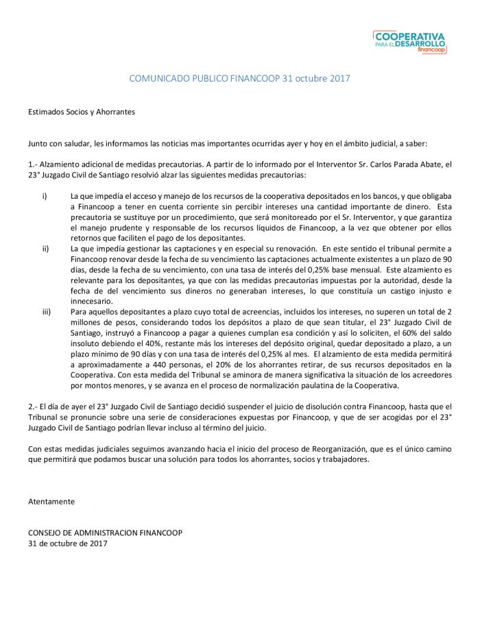 Por su parte Financoop emitió el siguiente comunicado: