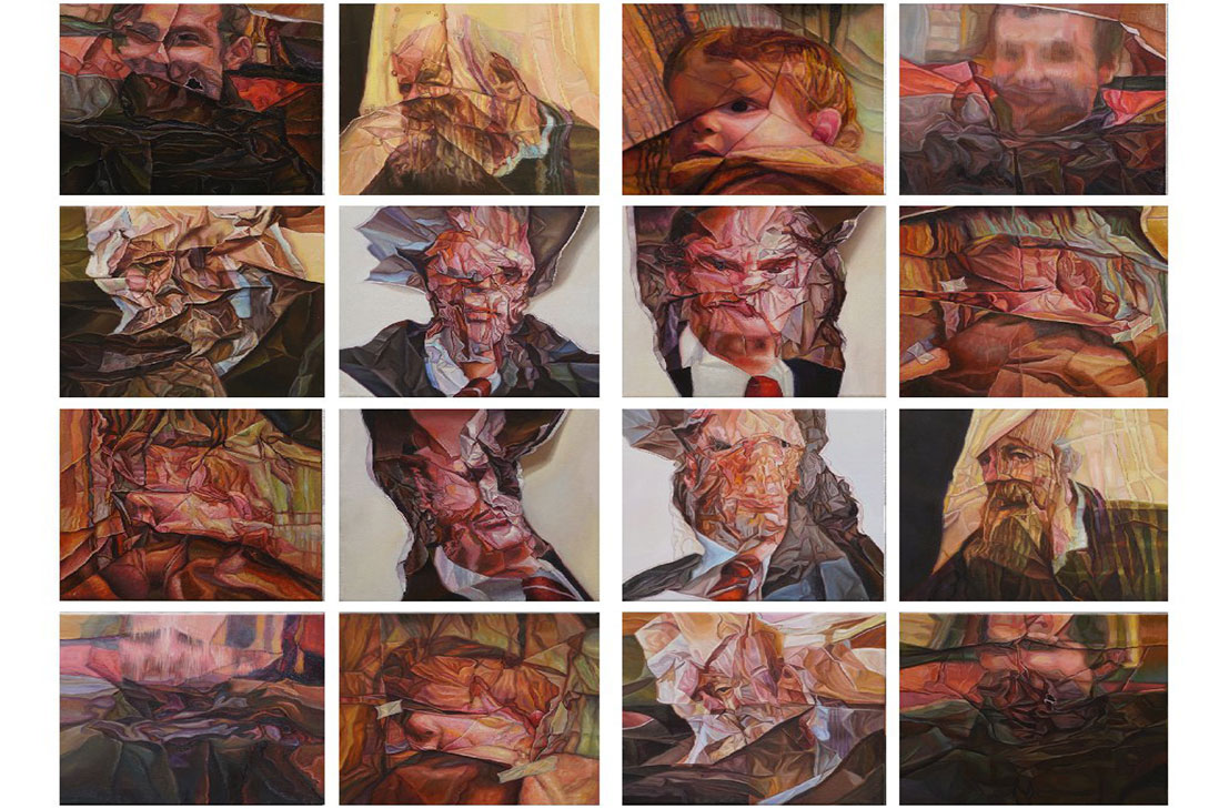 Fotografíe seis modelos. Imprimí las fotografías, y procedí a arrugarlas, plegarlas, rasgarlas, mancharlas, etc. Arrugué los rostros “modelando” sus expresiones según la cantidad, posición y dirección de los pliegues y arrugas, generando posibilidades para cada personaje, en diálogo y tensión con las hipótesis del resto del grupo.
