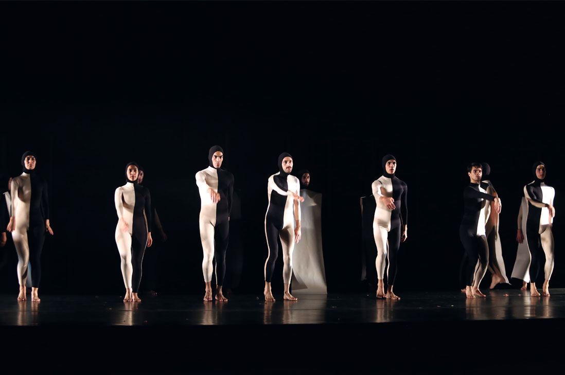 En escena, se combinan elementos geométricos, luz y composiciones, generando un efecto propio del Op Art, ambigüedad entre lo que se ve y la realidad. Los bailarines se disponen en filas horizontales sobre el escenario y realizan movimientos en armonía con una luz y proyección que los hace camuflarse en un calce y descalce propio de la obra de Pérez.
