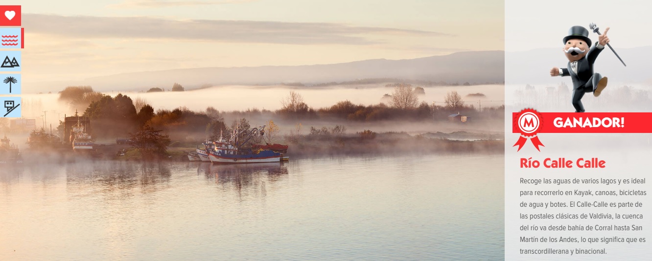 Es así como Hasbro acaba de anunciar 4 de los 22 lugares que tendrán asegurado un casillero en la nueva versión chilena del clásico juego de mesa. “Quisimos que este tablero lo hiciéramos todos. Por eso convocamos a la gente a votar por sus lugares favoritos en www.votamonopolychile.cl y Laguna Roja, Punta Lobos, Río Calle Calle y Lago Llanquihue se convirtieron en algunos de los preferidos”, asegura Francisca Hoces De La Guardia, Brand Manager de Hasbro Gaming.