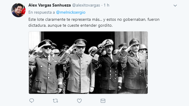 Sin embargo, la respuesta fue inmediata de parte de los cibernautas que se lanzaron con todo a retrucarle la frase usada por Melnick, a quien le respondieron con fotografías de él junto a Augusto Pinochet, los integrantes de la Junta Militar o la típica en que aparece junto al condenado CNI, Álvaro Corbalán Castilla.