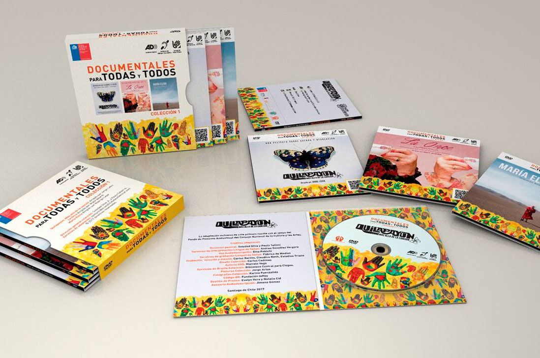 Esta caja de colección de documentales será distribuido gratuitamente a organizaciones sociales e instituciones que acogen a personas con discapacidad sensorial en todo Chile. La carátula de cada uno de los documentales lleva el nombre de la colección y de la obra escrito en braille y un código QR por película, para descargar el audiodescripción del film.