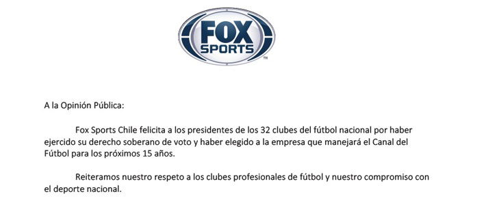El siguiente es el «Comunicado de los clubes del fútbol profesional: Los 31 clubes de la Primera División y Primera B pertenecientes a la ANFP, hemos tomado el día de hoy la decisión de adjudicar el Canal del Fútbol a la firma estadounidense Turner Broadcasting System, por haber presentado la mejor propuesta sobre la administración de los derechos de televisión del fútbol profesional chileno.