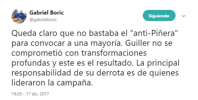 “Queda claro que no bastaba el “anti-Piñera” para convocar a una mayoría. Guiller no se comprometió con transformaciones profundas y este es el resultado. La principal responsabilidad de su derrota es de quienes lideraron la campaña”, escribió el parlamentario.