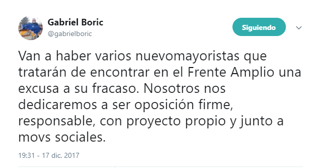 Y posteriormente señaló en otro mensaje que “Van a haber varios nuevomayoristas que tratarán de encontrar en el Frente Amplio una excusa a su fracaso. Nosotros nos dedicaremos a ser oposición firme, responsable, con proyecto propio y junto a movs sociales”.