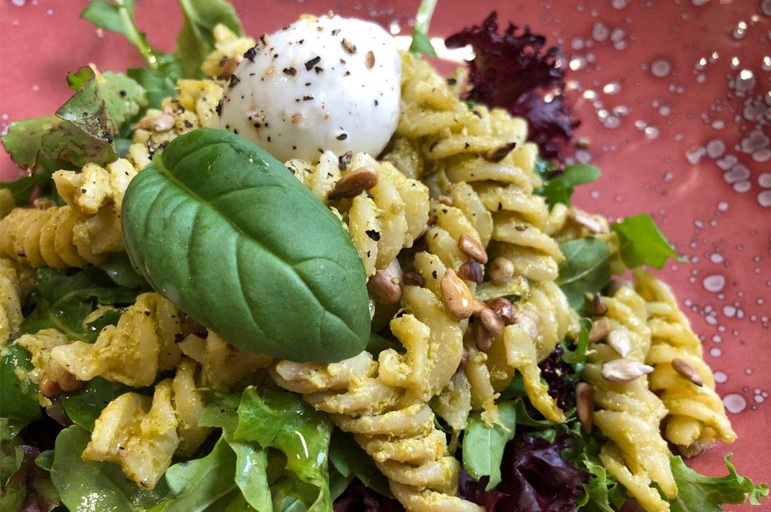 – Fusilli frio con mix de verdes, mozzarella de búfala y semillas tostadas.
