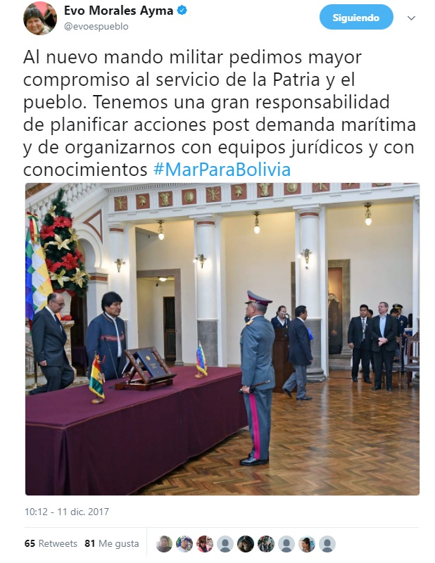 «La participación de hermanos militares, sea almirantes, generales, que tengan conocimiento científico tecnológico va ser importante para seguir desarrollándonos», dijo y pidió al nueva Alto Mando Militar disciplina y compromiso para servir a la patria y al pueblo. “destaco la necesidad de planificar acciones post demanda marítima y de organizar equipos jurídicos y con conocimientos sobre el centenario diferendo con Chile, que en febrero de 1879 invadió suelo boliviano y se apropió de 400 kilómetros de litoral y 120.000 km2 de territorios de desembocadura en el mar Pacífico”, reporta la nota oficial emitida por Palacio Quemado.