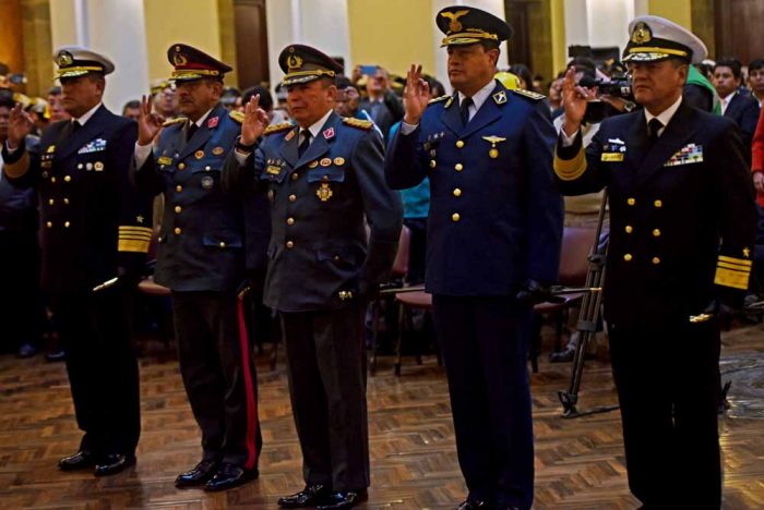 A su turno, el nuevo comandante en Jefe de las FFAA, Yamil Octavio Borda, se comprometió a respaldar los lineamientos estratégicos planteados por el mandatario indígena para el desarrollo del país bajo el principio de soberanía y en el marco del respeto, igualdad, complementariedad, solidaridad y equidad.