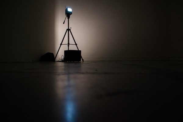Entre ellos se encuentran antiguos televisores, cámaras de vigilancia, un osciloscopio análogo (instrumento de medición para la electrónica) y un metrónomo (aparato utilizado para indicar tempo o pulso de las composiciones musicales), a los que se suma la penumbra y un delgado hilo de luz natural que ingresa desde el parque.