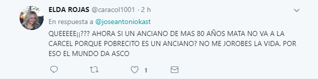 Posteriormente, puso en su tuit “En Chile tenemos ancianos presos, civiles y militares, que apenas pueden ponerse de pie y que requieren atención médica permanente. ¿Qué sentido tiene mantenerlos en la cárcel? Indulto, arresto domiciliario, vigilancia permanente. Todos tienen derechos humanos”.
