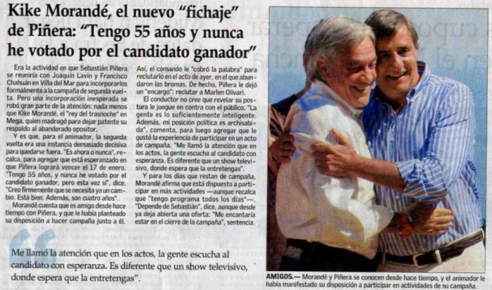 Pero no es primera vez que Morandé manifiesta su apoyo al ex Mandatario, ya lo había hecho en 2009, tal como lo consigna El Mercurio del 31 de diciembre de ese año (C7).