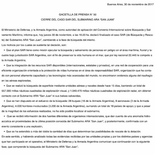 «El Ministerio de Defensa, y la Armada Argentina, como autoridad de aplicación del Convenio Internacional sobre Búsqueda y Salvamento Marítimo, informa que, hoy jueves 30 de noviembre, a las 16:20 hs. declaró finalizado el caso SAR (de Búsqueda y Rescate) del Submarino ARA «San Juan», cambiando a la fase de búsqueda del mismo.