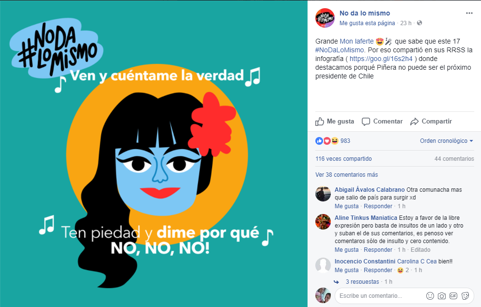 En la aplicación Instagram, la cantante publicó una gráfica del fanpage #Nodalomismo, el cual está orientado a captar a jóvenes que estén a favor del senador por Antofagasta.
