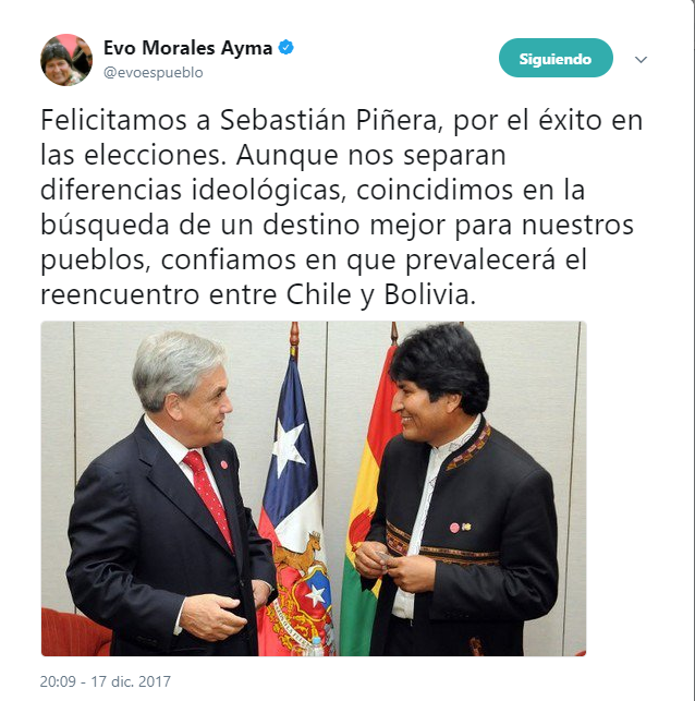A través de su cuenta en Twitter, el jefe de Estado boliviano escribió “Aunque nos separan diferencias ideológicas, coincidimos en la búsqueda de un destino mejor para nuestros pueblos, confiamos en que prevalecerá el reencuentro entre Chile y Bolivia”.