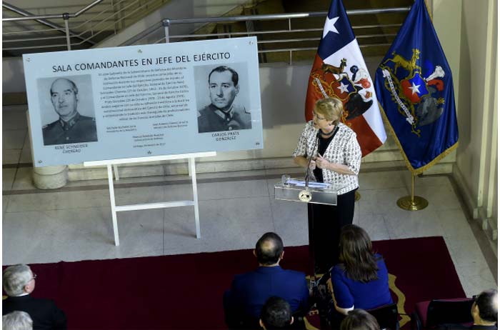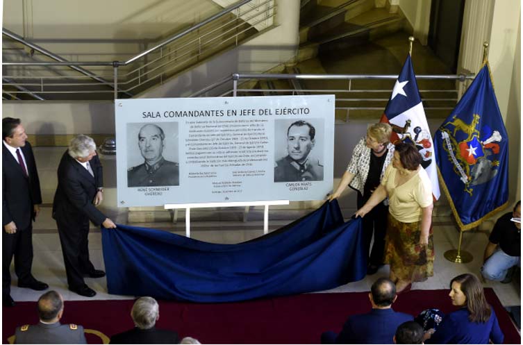 Hasta el ministerio de Defensa Nacional llegó la Presidenta de la República, Michelle Bachelet, para encabezar la ceremonia de develación de una placa conmemorativa en el quinto piso del remodelado y tradicional edificio de la Deensa de calle Zenteno 45, donde estuvieron las oficinas de los comandantes en jefe del Ejército generales René Schneider Chereau y Carlos Prats González.
