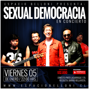 Para iniciar el año con energía y buena música, no te puedes perder el concierto que realizará Sexual Democracia, una de las bandas nacionales icono de década de los 90′, el próximo viernes 5 de enero a las 22:00 hrs. en espacio Belloni.