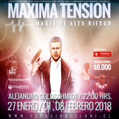 Alejandro Goldschmidt, creador de la primera compañía de magia en Chile, se presentará en Espacio Belloni con su espectáculo “Máxima Tensión”, una apuesta magistral, que además de grandes Ilusiones -acompañadas con profesionales de la danza- incluye momentos de humor, tensión y adrenalina.
