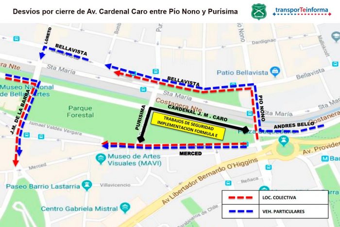 Para este jueves entre las 22:00 horas y las 06:00 horas se llevará a cabo el ensayo general de la competencia que incluye todos los cortes programados, obligando a los conductores a usar el eje Bellavista y la Costanera Norte en ambos sentidos. Para esto tendrán que ingresar al centro por Recoleta y San Antonio por el norte y por el lado sur Alameda, Diagonal Paraguay, Rancagua y Providencia.